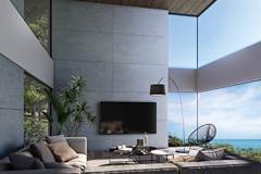 フレキシブル板の持つセメント色を活かした不燃内装化粧板の販売を開始しました。落ち着いたコンクリート調の風合いが、和洋を問わず優雅な空間を演出する内装仕上げ材です。素材自体を生かした密やかで、ランダムな表情をお楽しみいただけます。